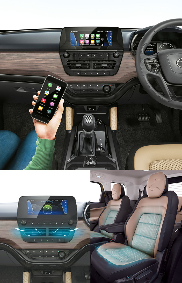 Grassland beige, inspired by the majestic grasslands of Kaziranga, was chosen as the body paint colour — the range’s key USP. The tropical wood dashboard and the earthy beige leatherette upholstery and inserts make the interiors of the vehicles truly thematic. The embossed outlined torso of two rhinoceroses facing each other on the front headrests and the addition of a new satin black rhino mascot on the front fender, symbolise the rugged toughness of the SUVs.