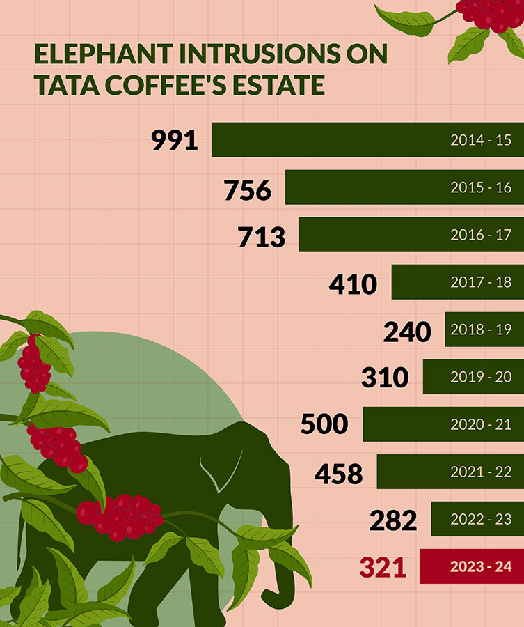 With a population of 6,000 elephants in Karnataka, many of whom constantly intrude into the company’s plantation area, and approximately 15,000 Tata Coffee workers working in the estate, there is plenty of room for potential conflict.